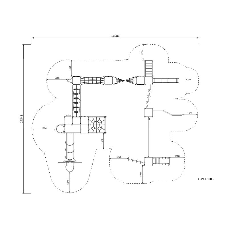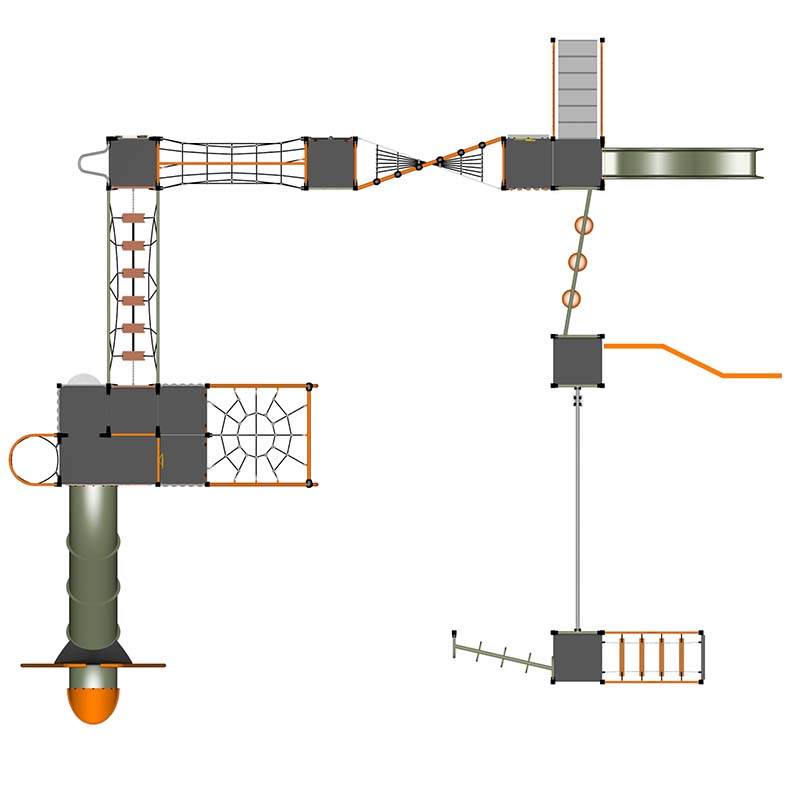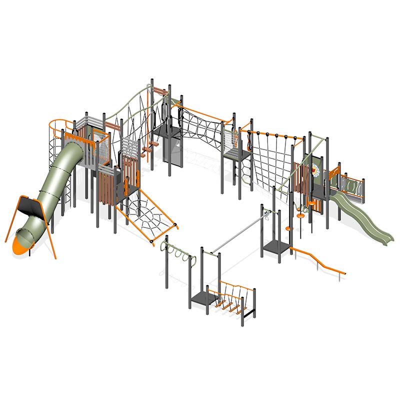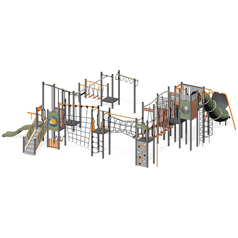 Jungle gym. This large Elevate playground has all the elements of a ninja course locked into one structure. Climbing, hanging, problem-solving, balance, agility and coordination are all challenged by this playground. Featuring Inclined Web, Rock Wall, Spiral Abacus, Fire Pole, Roman Rings, Hang N Glide, Balance Beam, Pommel Crossing, Rope Twist, Tube Net, Scatter Bridge, CLock Panel Tunnel Net and 2 Slides.