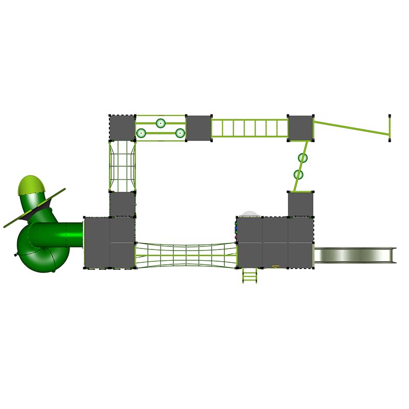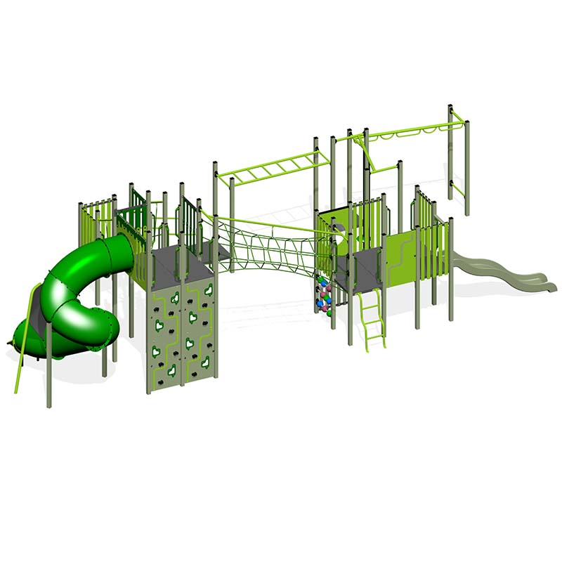 The thrill of the climb. This large Elevate playground has our Longest Tube net which is challenging and exciting to cross from the lower fort to the tallest tower! Once at the top, a zip down the spiral slide and it’s off to climb. We included Monkey Bars, Challenge Rail, Traverse Crossing, Congo Net, Web Wall, Rock Walls and Wave Ladder for the climbers and an Abacus and Spiral Abacus for the little ones.