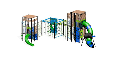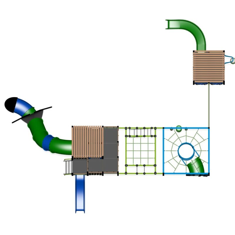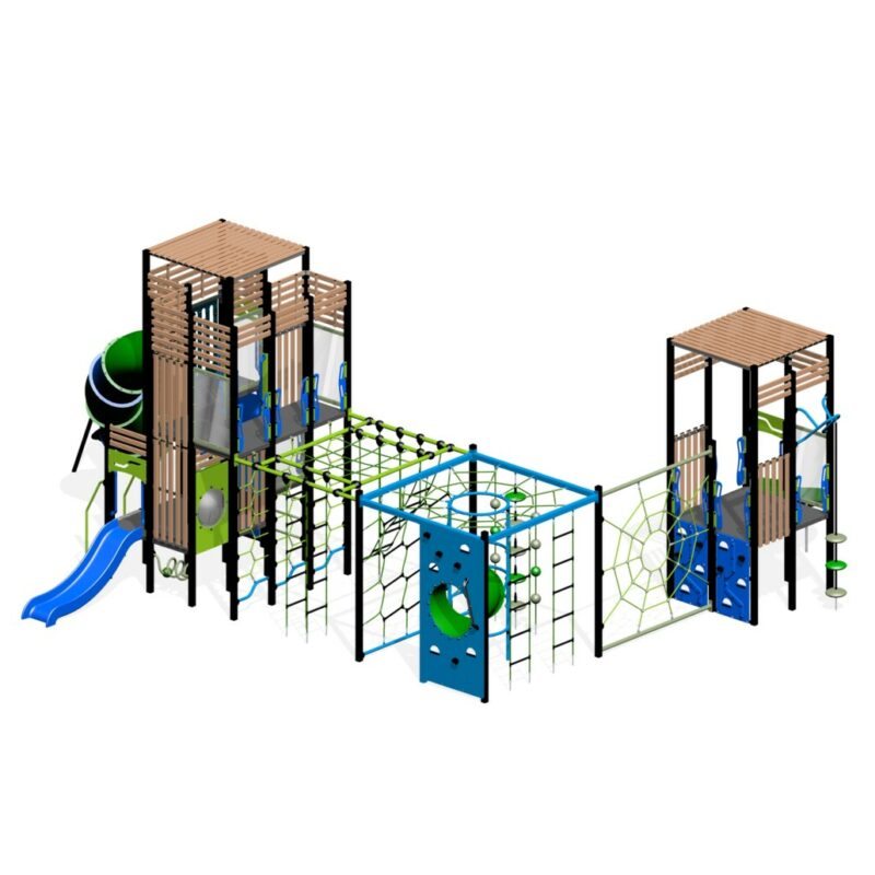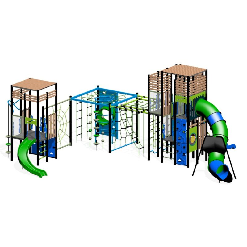 This large structure can cater to multiple kids of all ages. It includes two structures joined by a Cube 3P and cube joiners. The structures include a Tunnel Slide, Clock, Rock Face Under, Elevate Cube Joiner – Side Stairs, Two Ladders and Top Net, Web Wall, Pommel Climber, Spiral Abacus, Spider Net and Clock.