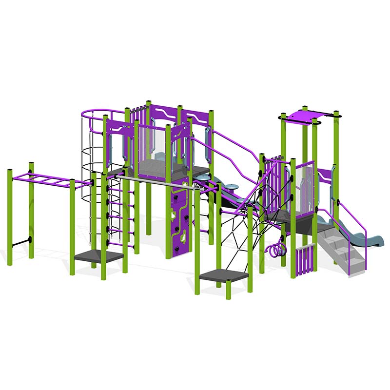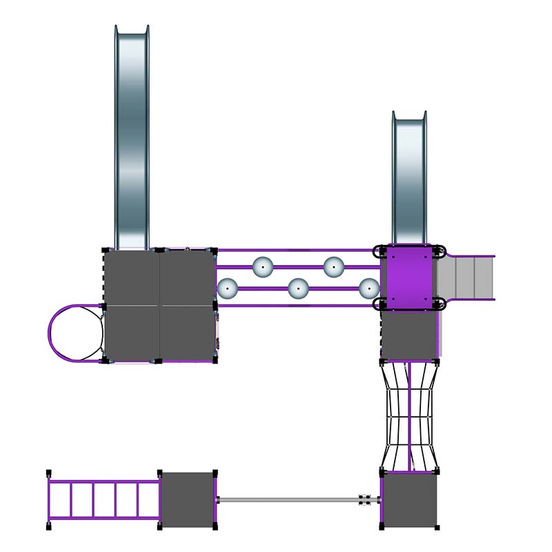 A playground with a view! Our tall Elevate playgrounds are great statement pieces for any park and we load them full of play value. This playground features Monkey Bars, A Hang N Glide, Rock Climbing Walls, Pommel Crossing, Tube Net and Web Walls. We also added 2 slides for all ages.