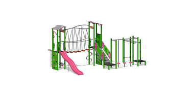 The adventurer’s playground! Monkey Bars, a Pommel Walker, Scatter Bridge Joiner, a Ladder Reach, Spiral Abacus and Xylophone. So many fun ways to cross from platform to platform!
