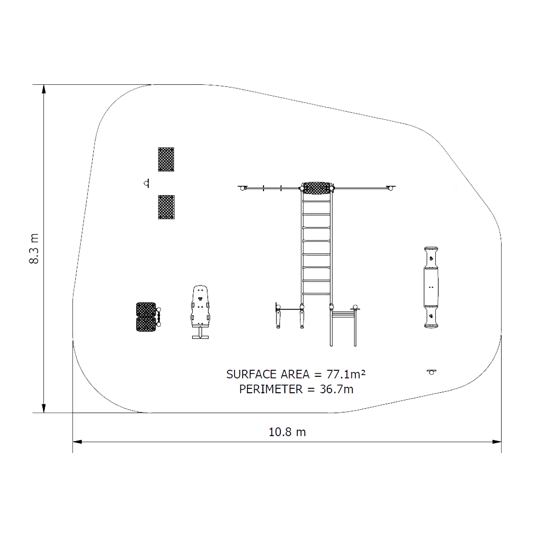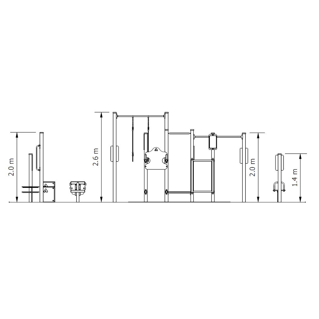 Our 7 Station Challenge is an intermediate to advanced outdoor fitness circuit with seven functional stations including gorilla bars, Roman rings, body dips, leg raises, sit up bench and step up station that deliver a varied strength and mobility workout for users aged 12 and up in parks and community spaces.
