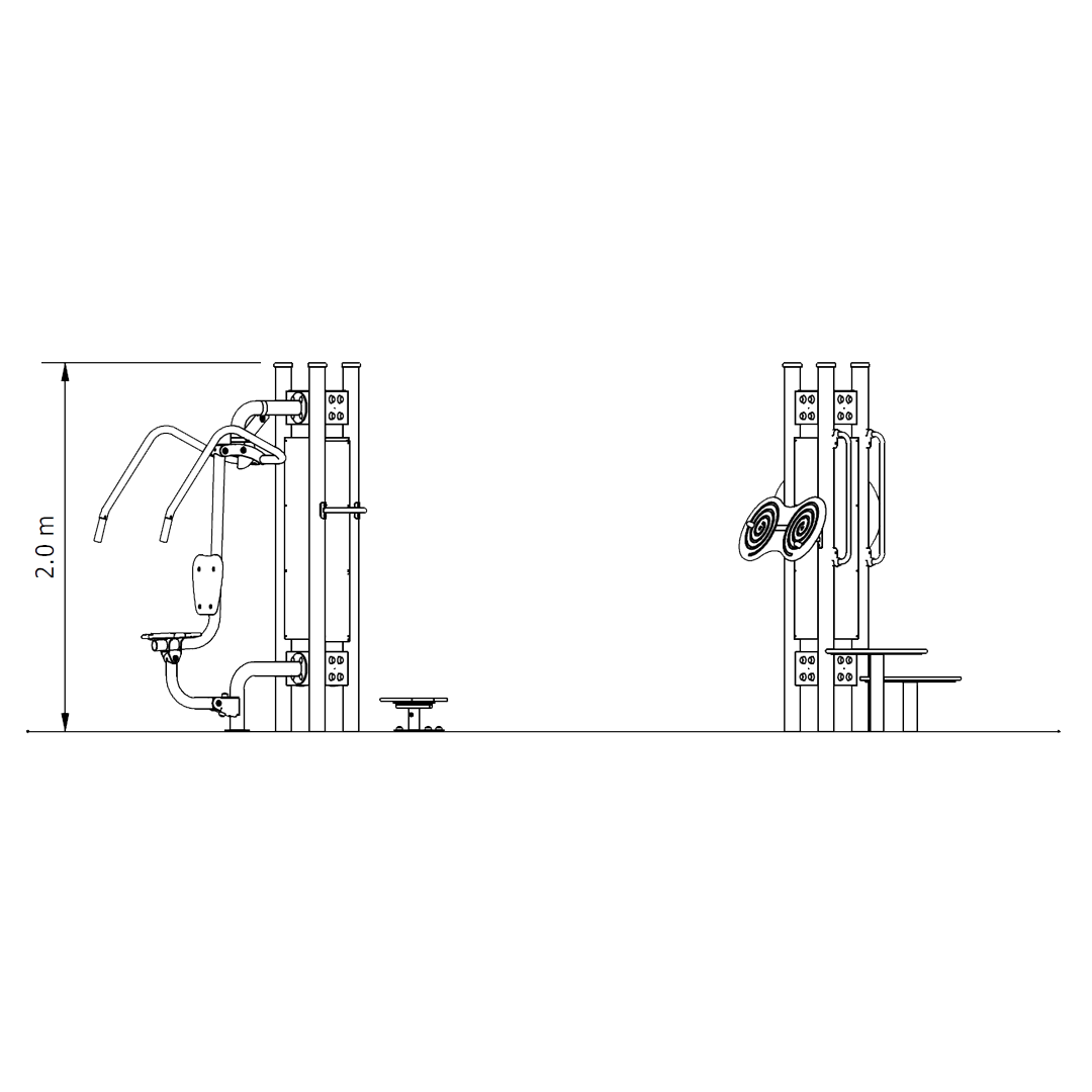 Our Seniors Gym is an outdoor fitness circuit tailored to older adults and low-fitness users that combines chest press, leg press, dexterity and shoulder mobility stations, plus step-up options to support strength, flexibility and everyday movement.