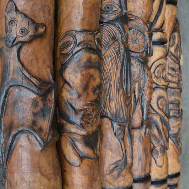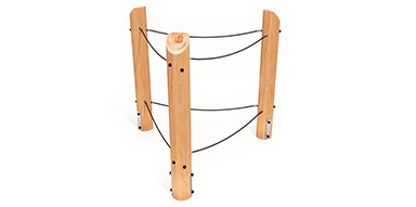 Carved Ironbark totems with rope balance bridge connections
