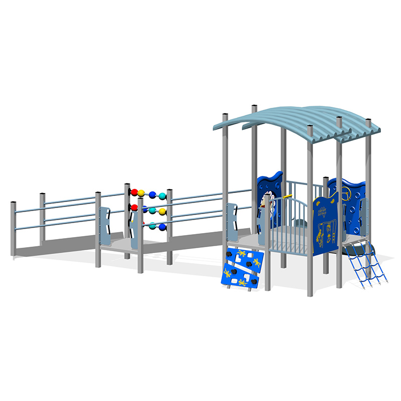 This accessible playground is an interactive playground that has Maze, Clock, Abacus and Steering panels that can easily be accessed by the 2 long ramps. We have also included our access safety panels so that children in wheelchairs can access the playground safely. An excellent playground for toddlers and new walkers as well!