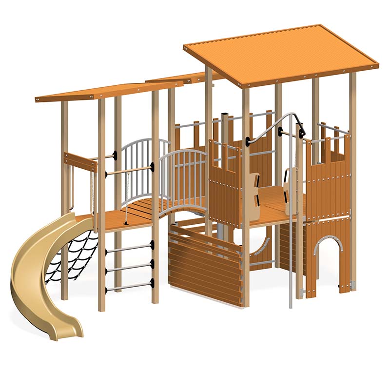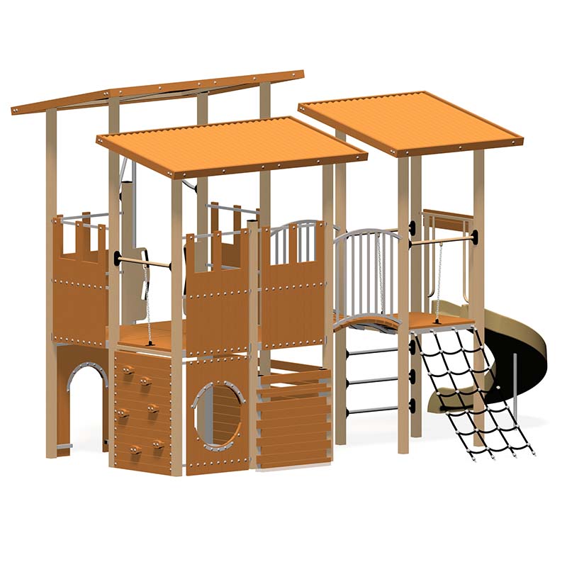 This timber nature playground features an awesome cubby with peeps holes and a Crawl Tunnel with a fort on the top. Climb up to the fort using the Rope Net Climber, Ladder or Rock Wall then slide down the Fire Pole or Slide to do it all again. This Playground will fit beautifully into any natural space and when paired with our Freestanding Timbe range – Natura – will make a fun and natural play space.