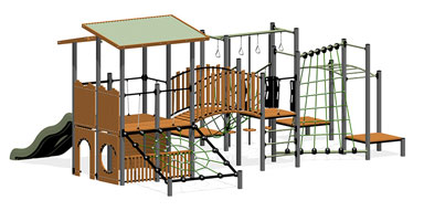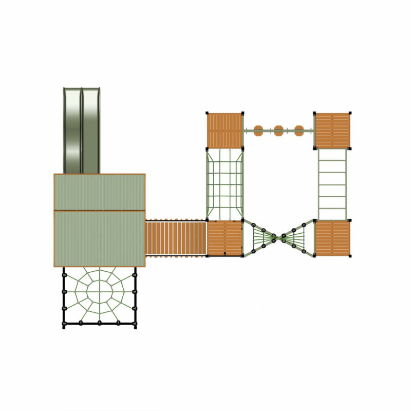 Double slide, rope twist net, monkey bars, climbing walls and much more. This structure would blend beautifully with a park back drop or residential area.