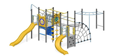 This compact playground is chock full of climbing elements. Curved Monkey Bars, Arched Web, Pommel Joiner, Clock Panel, Rock Wall, Shop COunter and Shop Shelves, as well as a Wave and Curved Slide and a Fire Pole and this playground, has something for everyone.