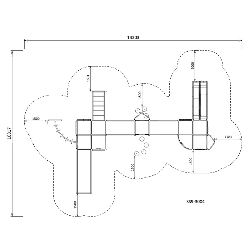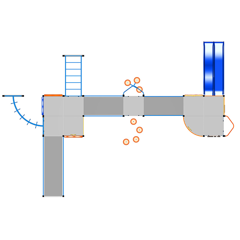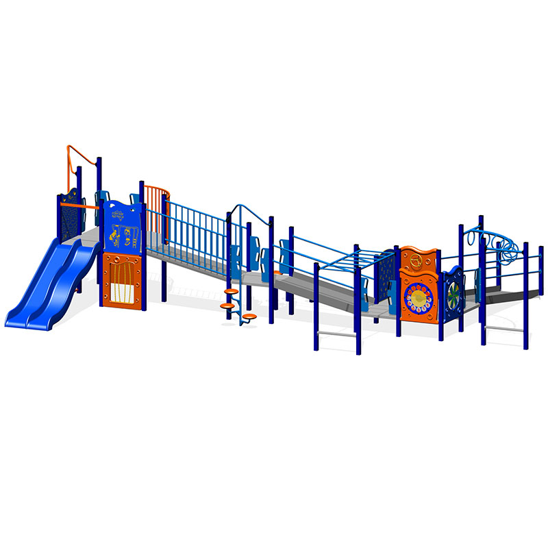 This accessible playground has 3 long ramps and wide platforms to accommodate wheelchairs. We have included interactive panels on the lower and higher levels and many low elements for younger children such as the Counter Panel, Squeeze Panel, Clock Panel and the Compass and Maze Panel on the higher level. The playground is easily accessible for toddlers, new walkers and kids in wheelchairs who have new play elements on each level. The Access Panels allow for safe travel of little ones and wheelchairs across the entrances and we’ve included a double slide (for racing!), a Fire Pole and Steppers to the higher level and a Step-Up Pole. We have also included playground favourites like Monkey Bars and Arched Roman Rings.