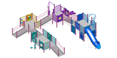 This accessible playground has 4 long wheelchair-accessible ramps kids can race around this large playground. With interactive panels on each level such as a Clock Panel, Abacus and Tic Tac Toe Panels over and under the platforms, we have included something for Toddlers, new walkers and children wheelchairs. We have also included two slides at different heights and climbing elements like a Fire Pole and a Web Tunnel. The playground is easily accessible for toddlers, new walkers and kids in wheelchairs with new play elements on each level.