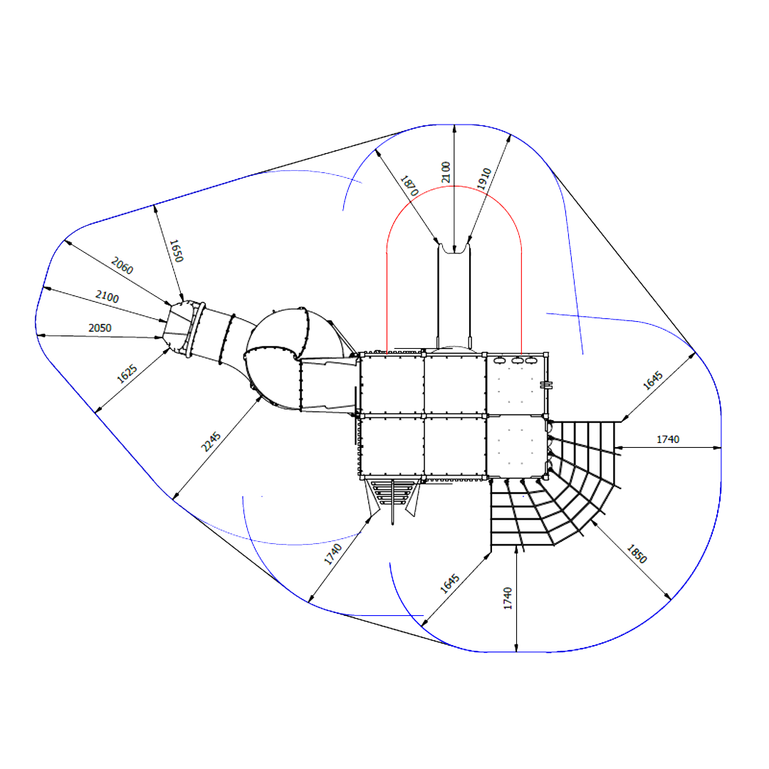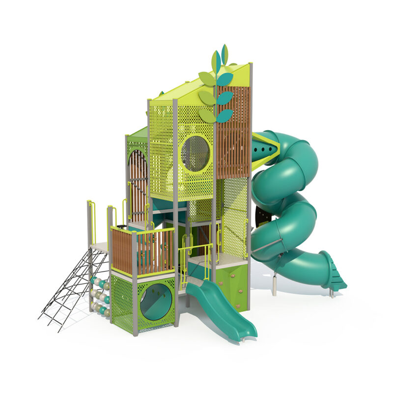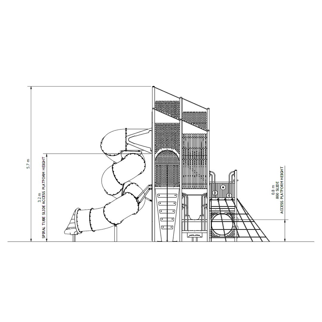At 5.7m tall, this tower has been designed to encourage children of all age groups to play together with different types of challenge and delight at each level. Robust climbers, low events, slides, tunnels and moments of surprise and discovery that will excite and inspire.