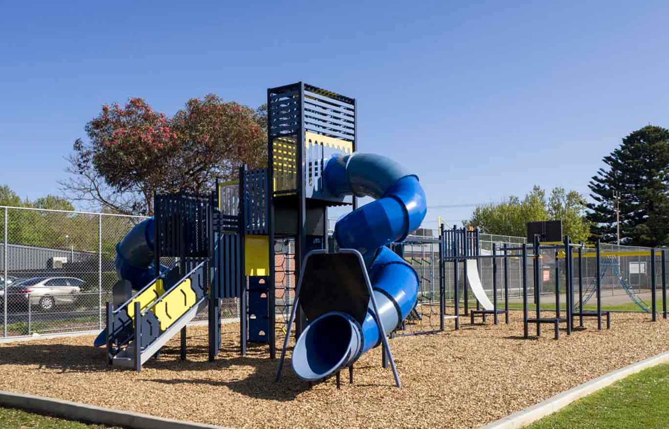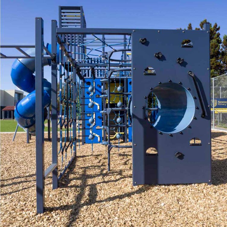 The new playground at Torrensville Primary School delivers a bold, activity driven play space designed to challenge, engage, and inspire students. Dominated by an expansive multi level play structure, the playground features a network of climbing frames, overhead elements, balancing challenges, and large enclosed slides that encourage confidence, coordination, and physical development. The open layout supports group play and social interaction, while the robust materials and contemporary colour palette create a visually striking and durable solution for a busy school environment. Designed to maximise play value and longevity, this playground provides students with an exciting outdoor space that supports active play every day.