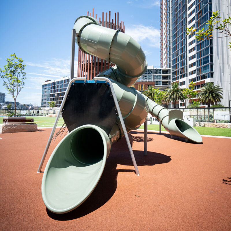 Working closely with LandFX, we proposed and co-designed a twin Lofts unit featuring single and double-storey towers with exciting tunnel slides. Once the design was finalised, we managed manufacturing and installation, completing the project with vibrant rubber softfall that ties the space together beautifully. Nestled against the backdrop of Parramatta’s tall buildings, this playground has become a true showstopper, embraced by the local community.